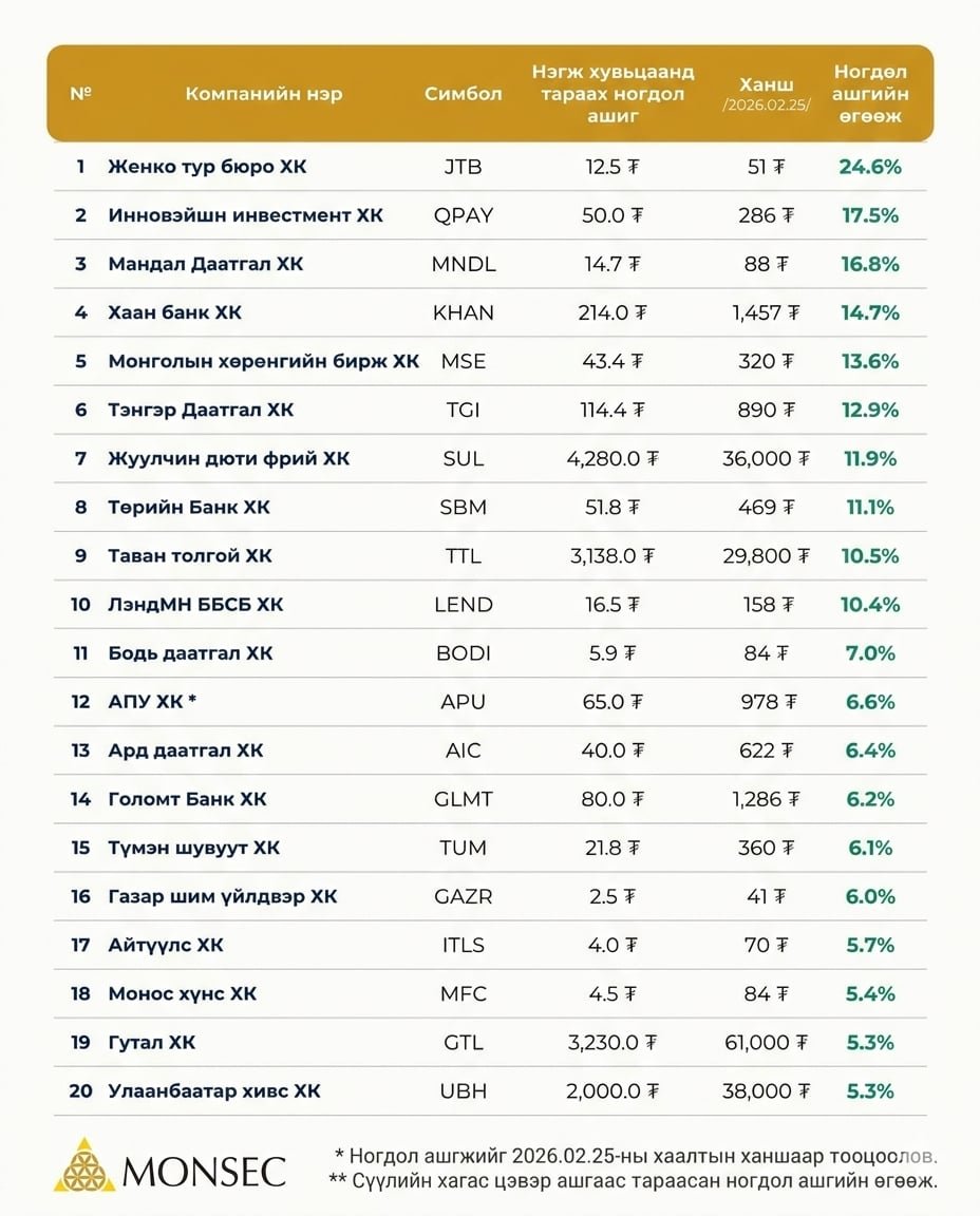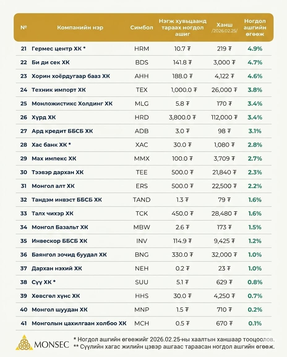 Одоогийн байдлаар 41 компани 2025 оны цэвэр ашгаасаа нийт ₮965.7 тэрбумын ногдол ашиг тараахаар шийдвэрлэсэн байна.